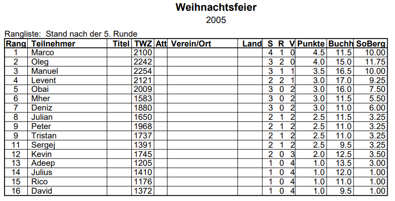 ersten Platz. Gratuliere. Als einziger Spieler erreichte er 4,5 aus 5 Punkte und gewann damit auch noch einen ansehnlichen Geldpreis.